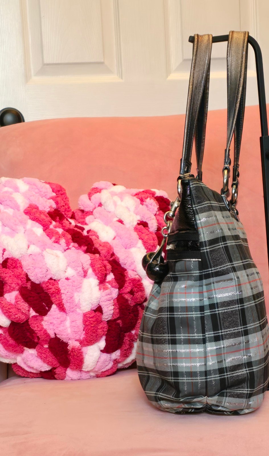 I love the Poppy bags and I'm glad they're getting the fun retro love they deserve. This one is in a blue and black tartan with red and silver accents. She's managed to hold onto both hang tags! Patent leather trim.