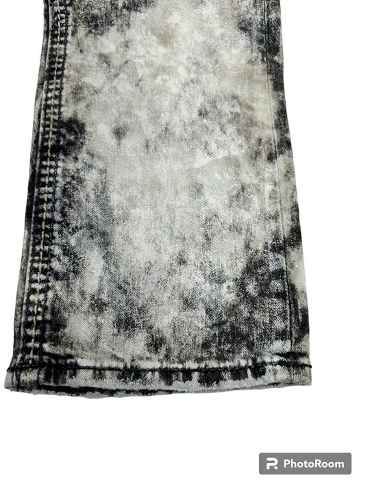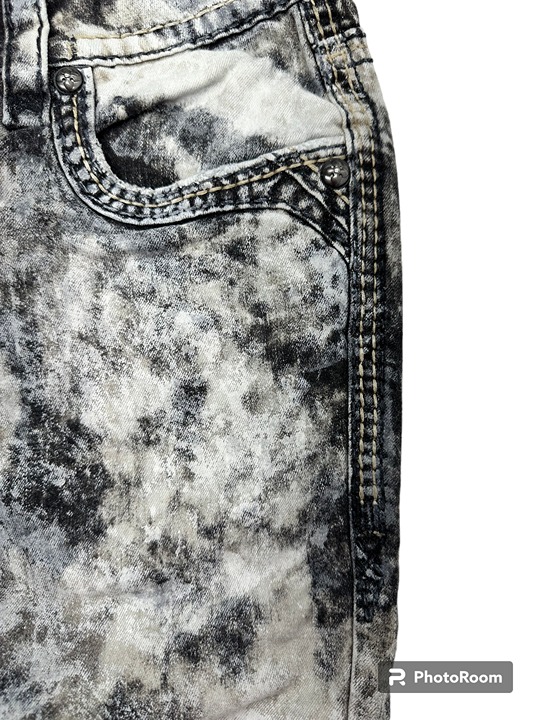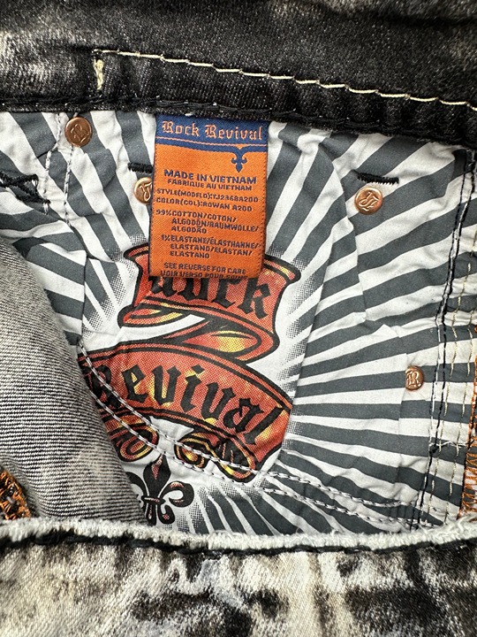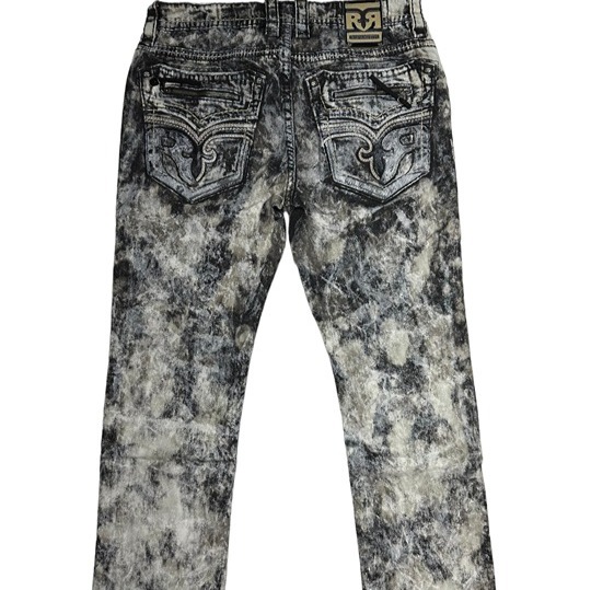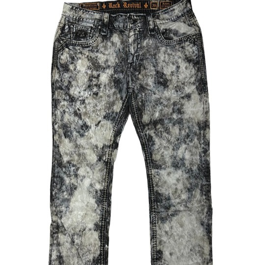 Rock Revival Rowan Alt Straight Jeans feature an acid washed/painted appearance, embroidered reversed Fleur de Lis and zipper detail on back pockets, and logo hardware throughout.